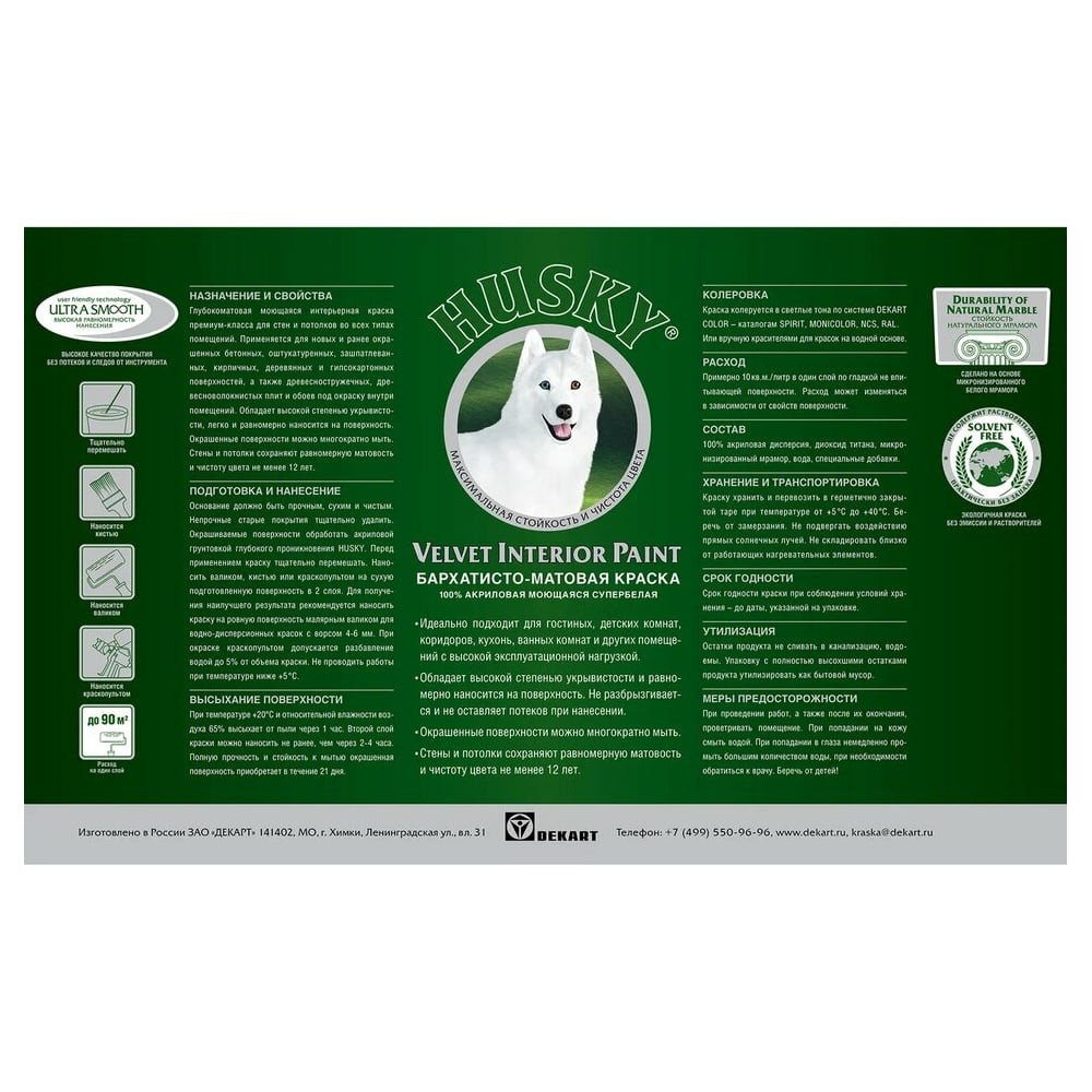 | Система колеровки | Dekart Color — каталогам SPIRIT, MONICOLOR, NCS, RAL. |