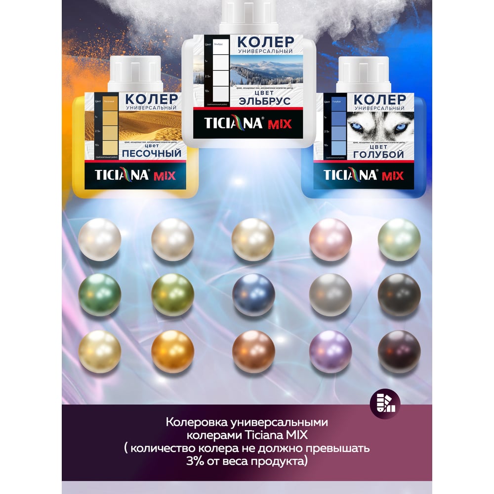 | Система колеровки | компьютерная колеровка машинным способом или вручную универсальными колерами Ticiana Mix |