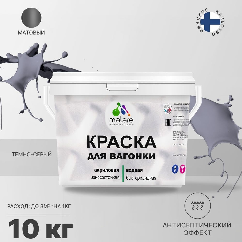 Краска MALARE для вагонки, с антисептическим эффектом, темно-серый, 10 кг КВГНКАТЕСМ1000