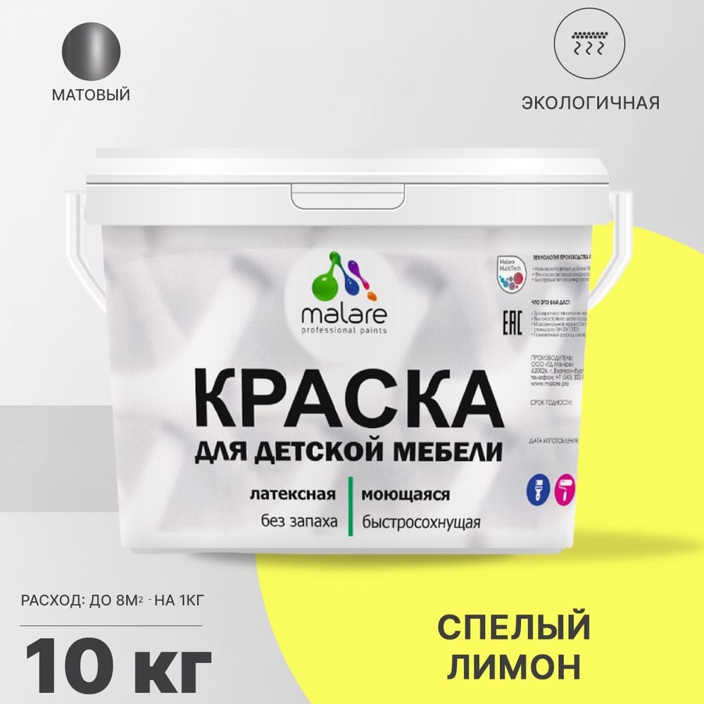 Акриловая краска MALARE для детской мебели для кухонных фасадов, мебели из дерева, моющаяся, быстросохнущая без запаха матовая, спелый лимон, 10 кг. КДТМБАСПЛМ1000
