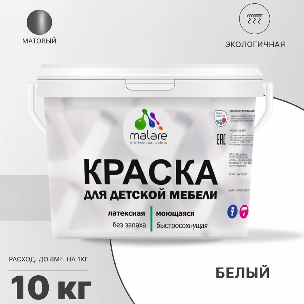 Акриловая краска MALARE для детской мебели для кухонных фасадов, мебели из дерева, моющаяся, быстросохнущая, без запаха, матовая, белый, 10 кг. КДТМБАБЕЛМ1000