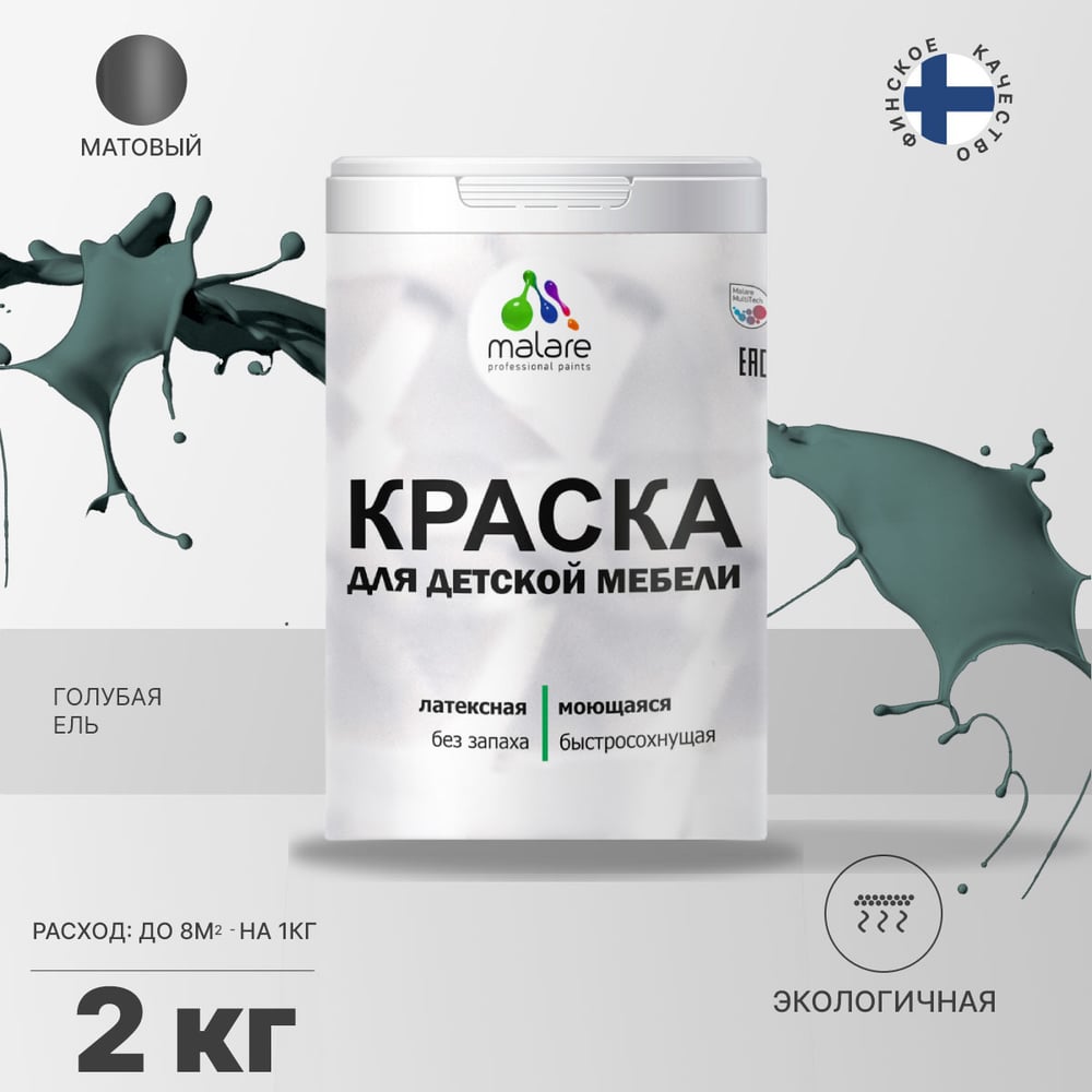 Акриловая краска MALARE для детской мебели для кухонных фасадов, мебели из дерева, моющаяся, быстросохнущая, без запаха, матовая, голубая ель, 2 кг. КДТМБАГОЕМ0200