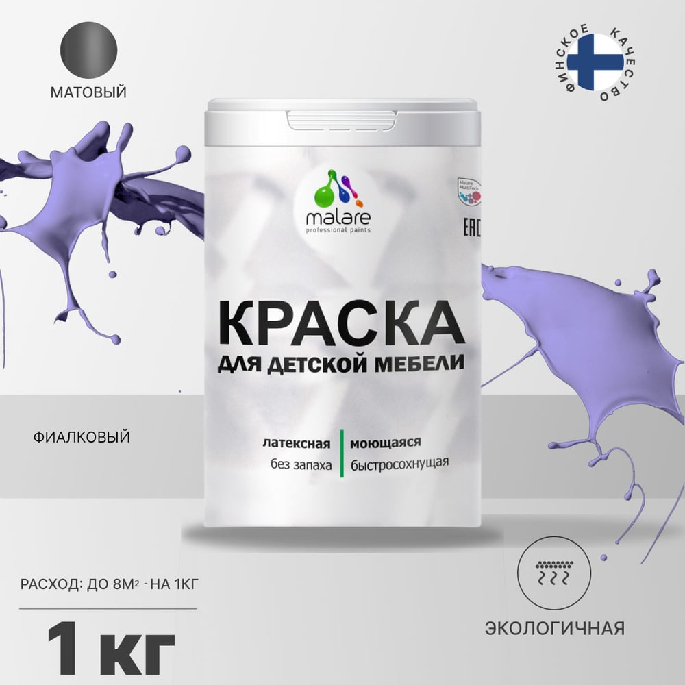 Акриловая краска MALARE для детской мебели для кухонных фасадов, мебели из дерева, моющаяся, быстросохнущая без запаха матовая, фиалковый, 1 кг. КДТМБАФИАМ0100
