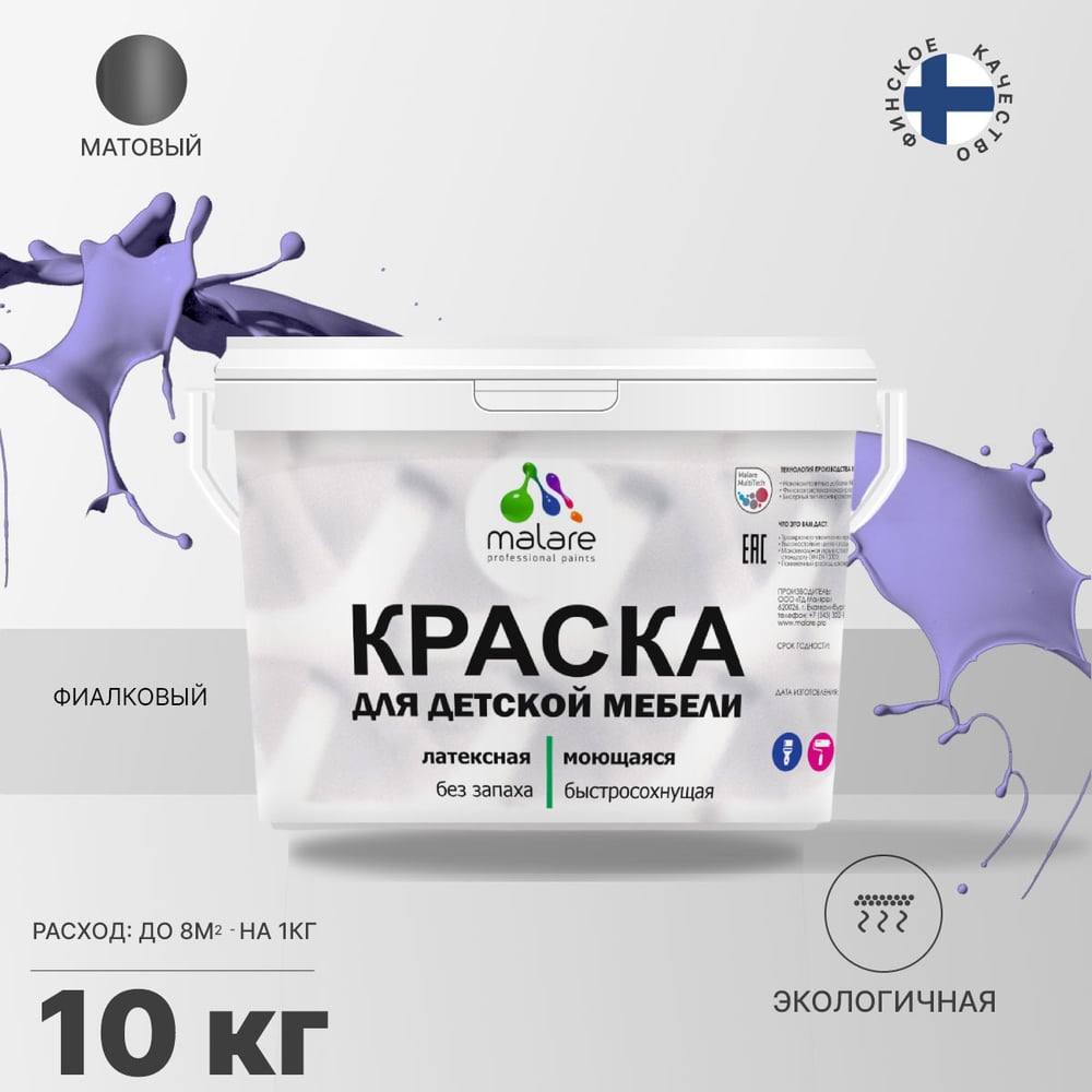 Акриловая краска MALARE для детской мебели для кухонных фасадов, мебели из дерева, моющаяся, быстросохнущая без запаха матовая, фиалковый, 10 кг. КДТМБАФИАМ1000
