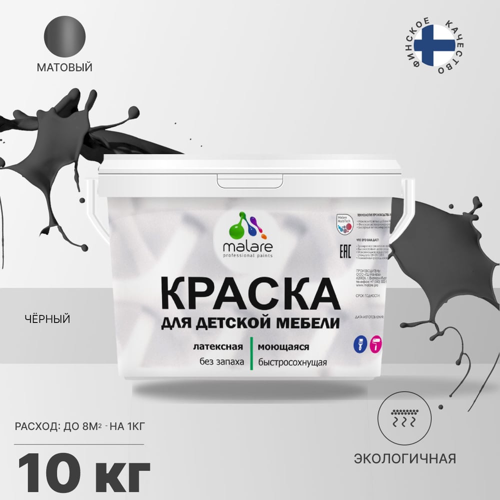 Акриловая краска MALARE для детской мебели для кухонных фасадов, мебели из дерева, моющаяся, быстросохнущая без запаха матовая, черный, 10 кг. КДТМБАЧЕРМ1000