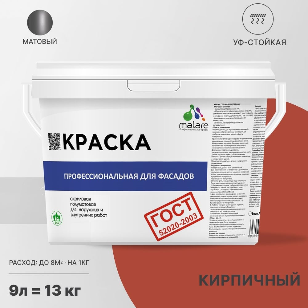 Фасадная краска MALARE ГОСТ быстросохнущая, кирпичный, 9 л 2036767857876