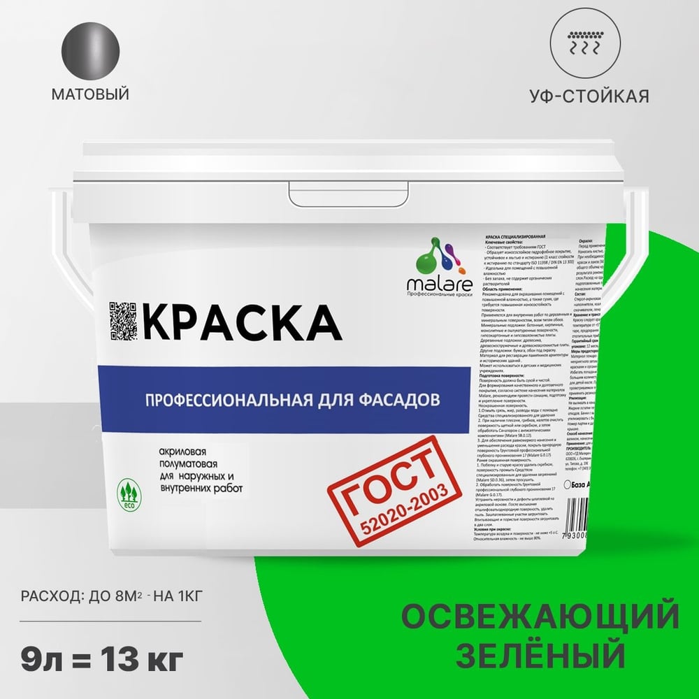 Фасадная краска MALARE ГОСТ быстросохнущая, освежающий зеленый, 9 л 2036767858002