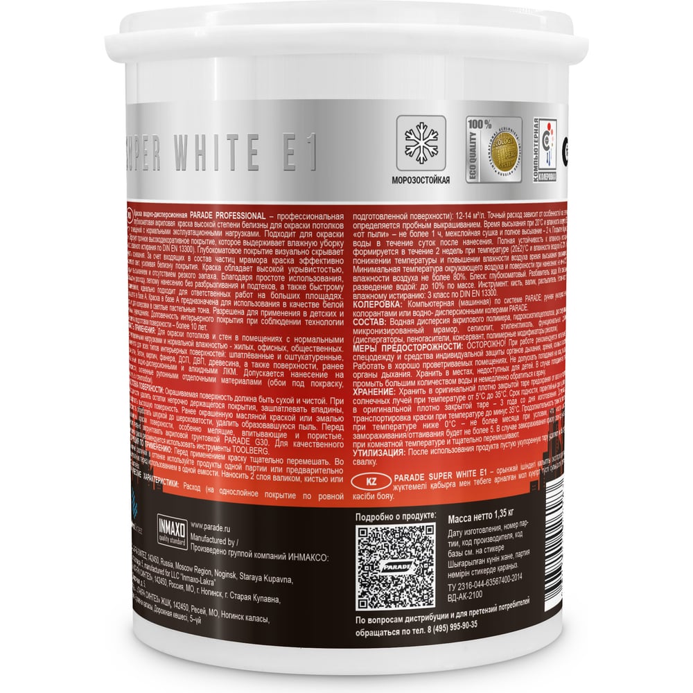 Краска для потолков PARADE SUPER WHITE E1 база А 0,9 л Россия Лк-00008436