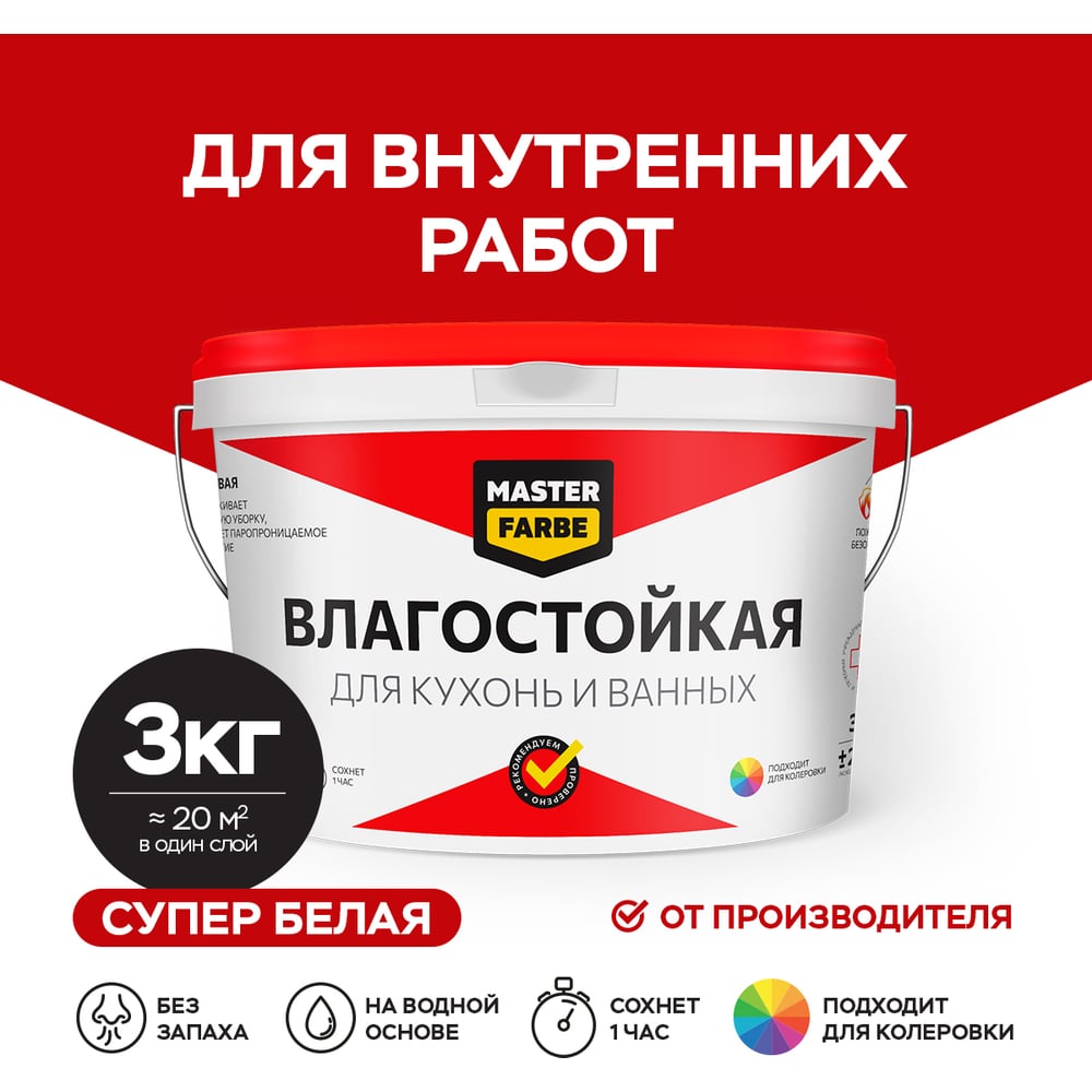 Водно-дисперсионная краска для помещений с повышенной влажностью MASTERFARBE (влагостойкая; белая; 3 кг) 4631159427538