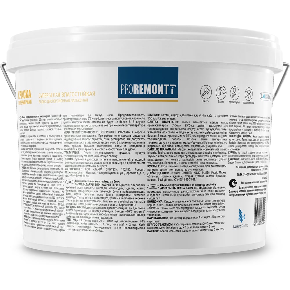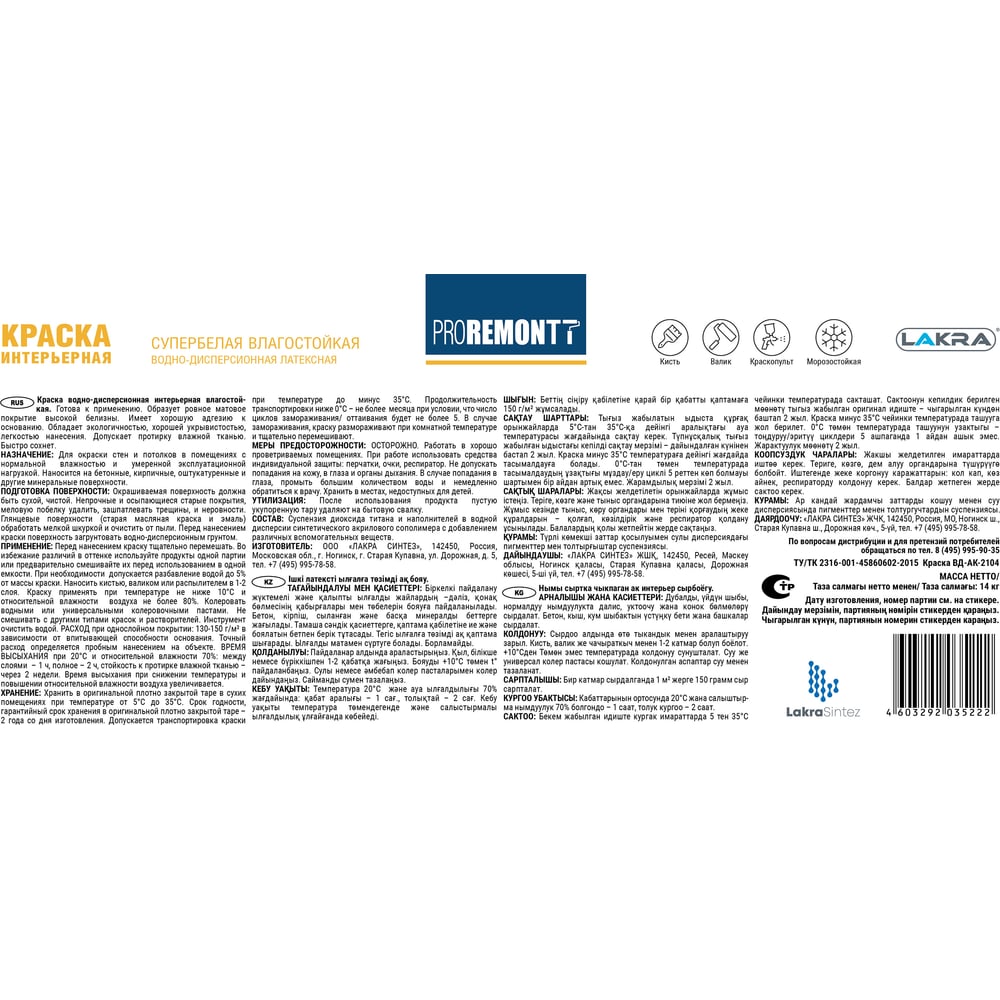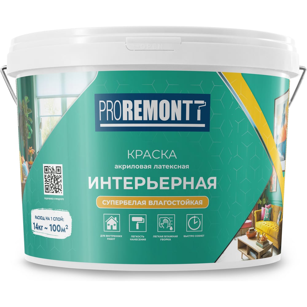 Интерьерная краска Proremontt влагостойкая, супербелая, 14 кг Лк-00012726