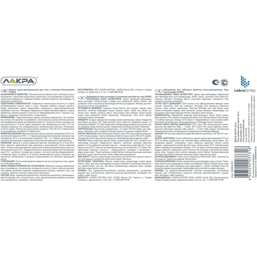 Краска для стен и потолков ЛАКРА акриловая, белоснежная, 6.5 кг 8306470 ЛА-00000040