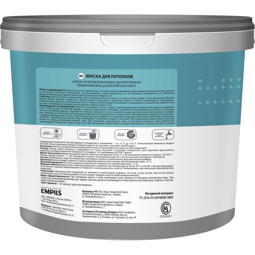 Водно-дисперсионная полиакриловая краска для потолков для внутренних работ ОРЕОЛ 5379