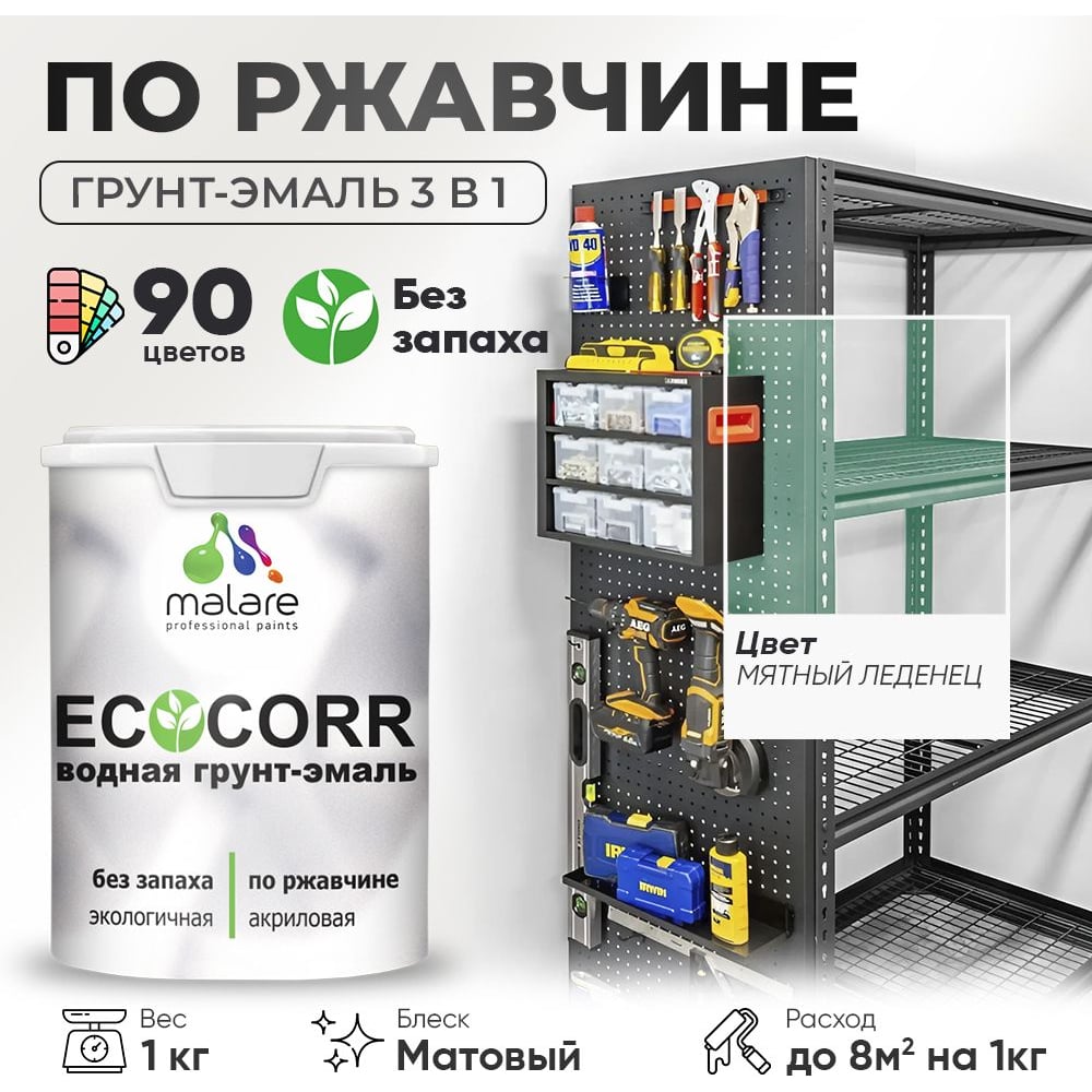 Грунт-Эмаль 3в1 MALARE EcoCorr для металлических поверхностей, акриловая быстросохнущая без запаха, матовая, мятный леденец, 1 кг ГЭЭКОМЯЛМ0100