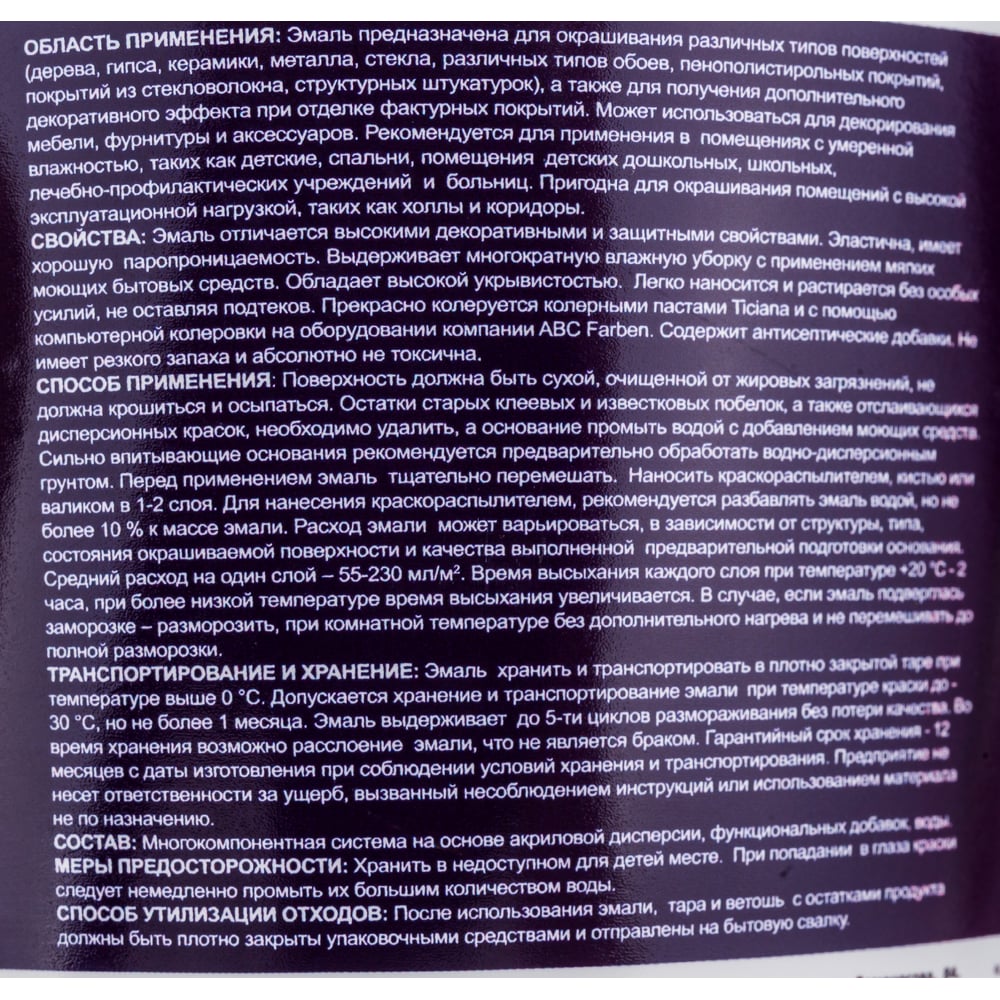 | Система колеровки | компьютерная колеровка машинным способом или вручную универсальными колерами Ticiana Mix |