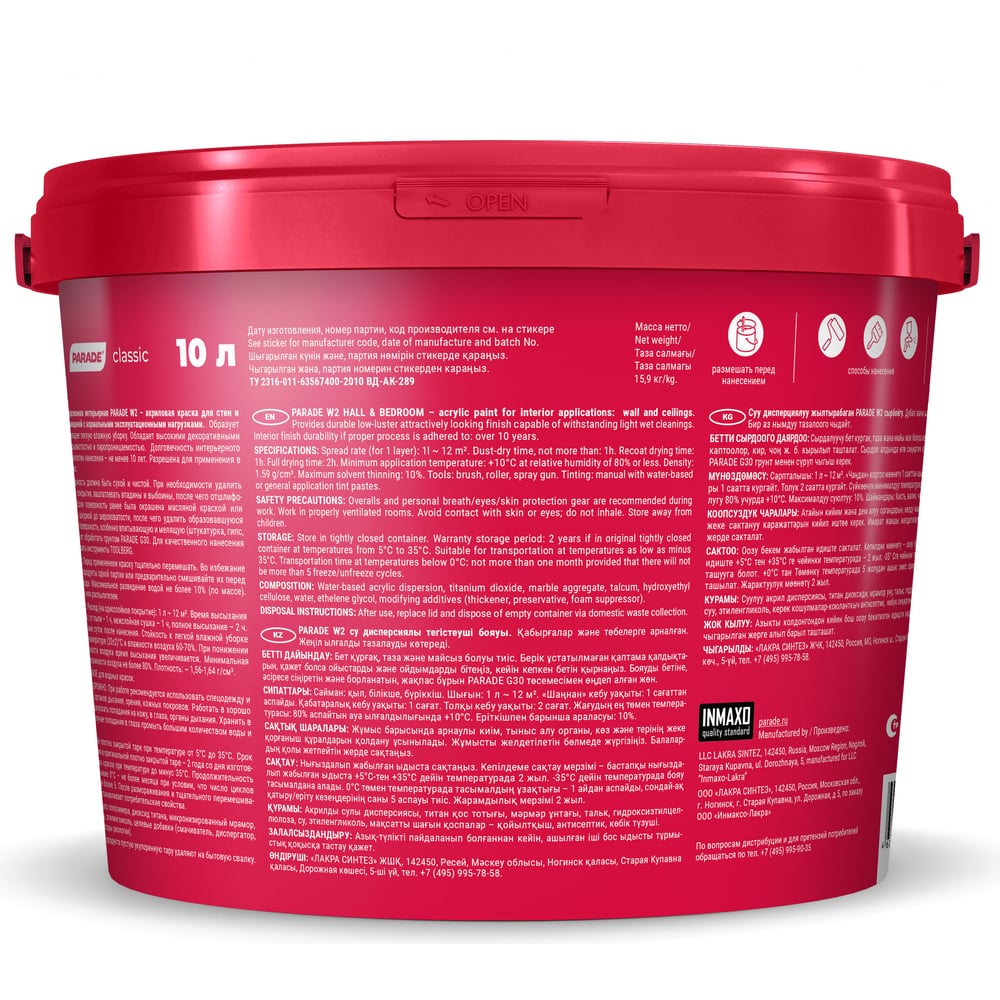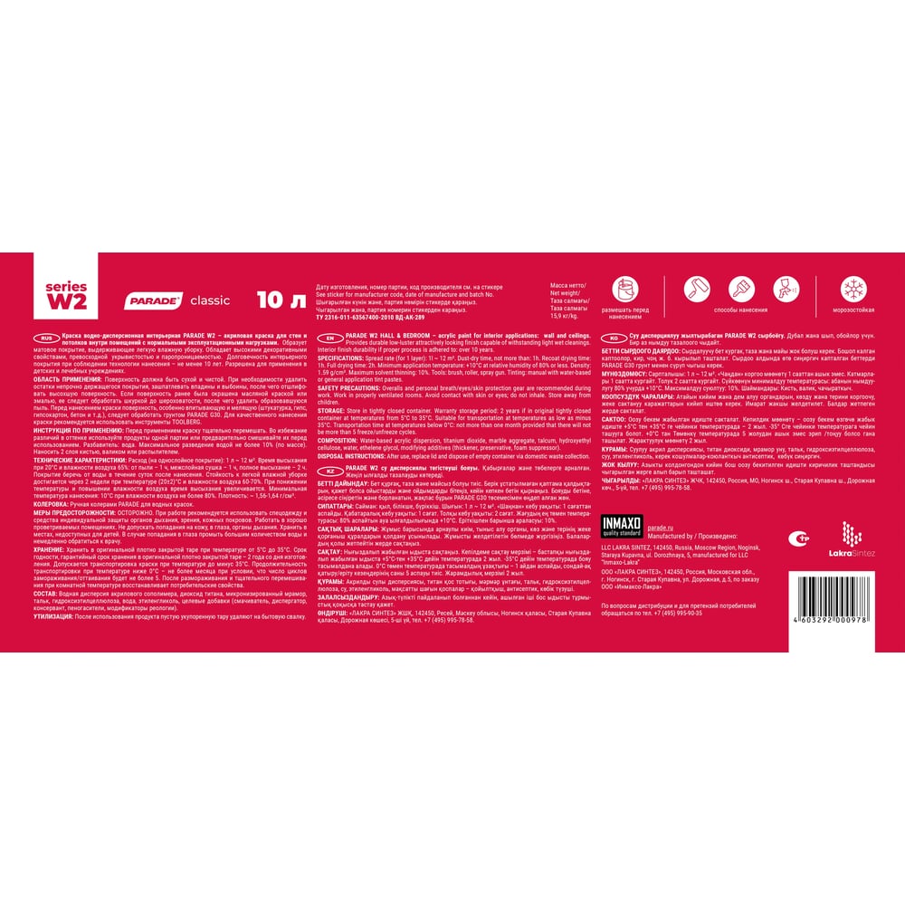 Краска акриловая PARADE W2 Гостиная & Спальня белая матовая 10 л Россия 90002000417