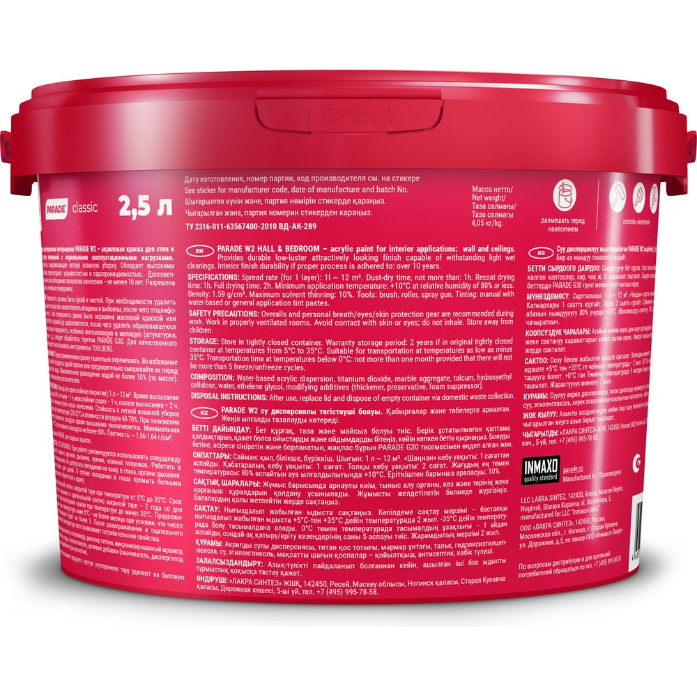 Краска белая акриловая матовая PARADE W2 Гостиная & Спальня 5 л Россия 90002002313