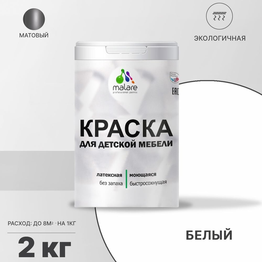 Акриловая краска MALARE для детской мебели для кухонных фасадов, мебели из дерева, моющаяся, быстросохнущая, без запаха, матовая, белый, 2 кг. КДТМБАБЕЛМ0200