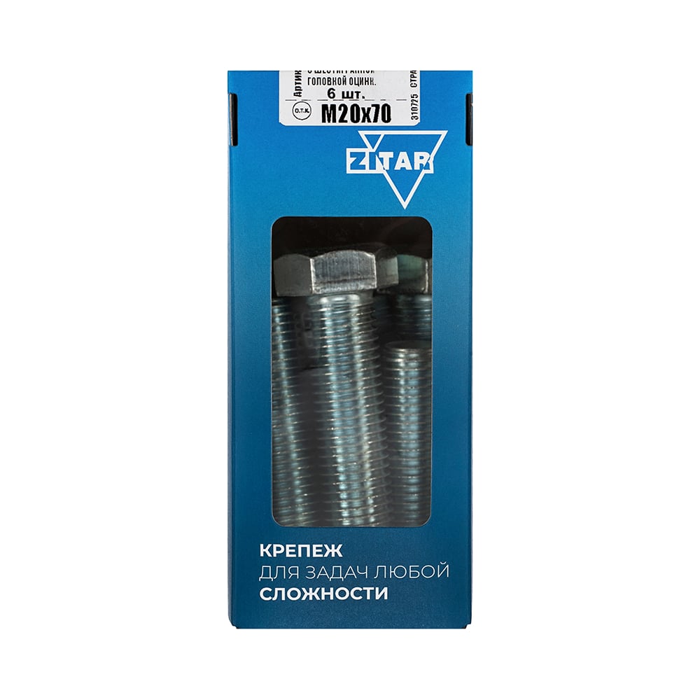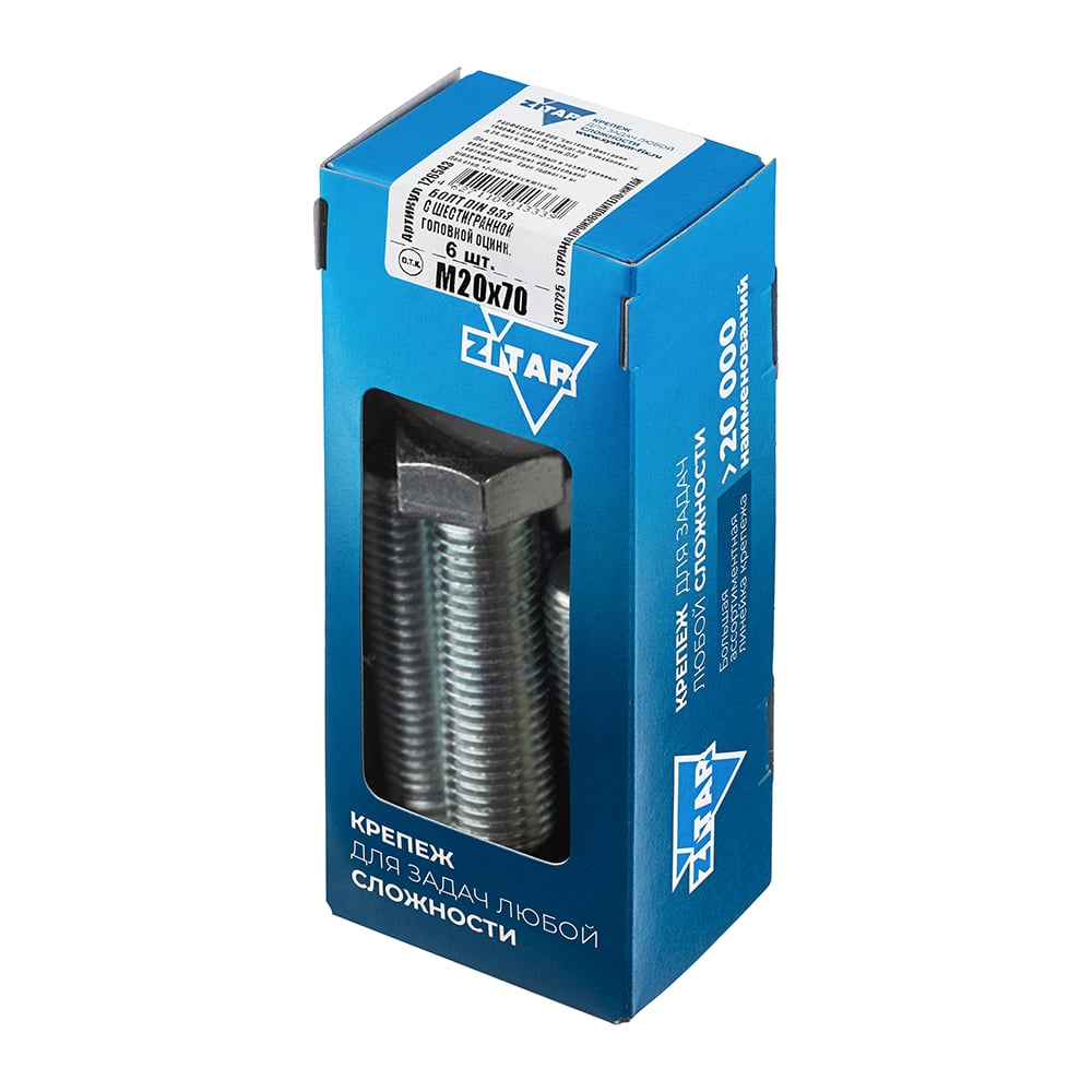 Болт с шестигранной головкой DIN933 оцинкованный, М20x70 мм, 6 шт в коробке с окном Zitar 126543