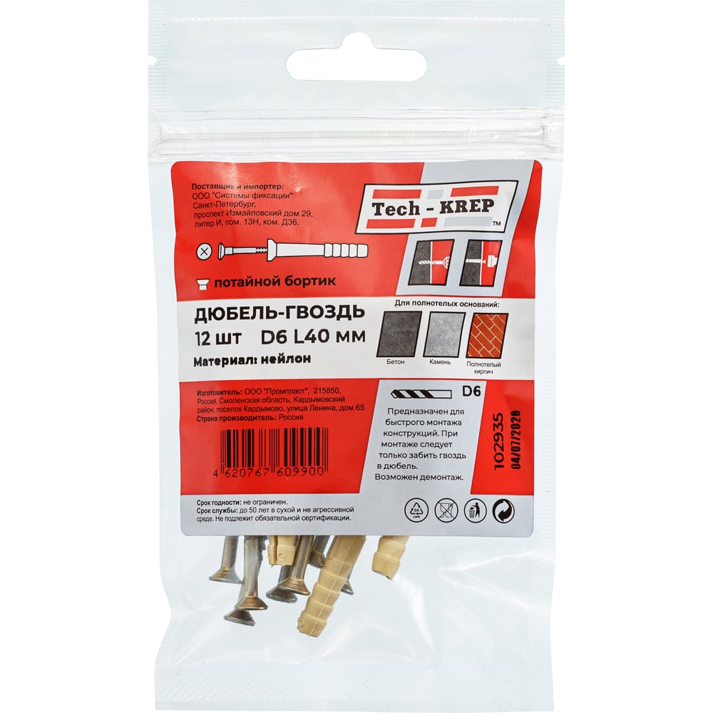 Дюбель-гвоздь Tech-Krep 6х40 потайная манжета, нейлон 12 шт - пакет 102935