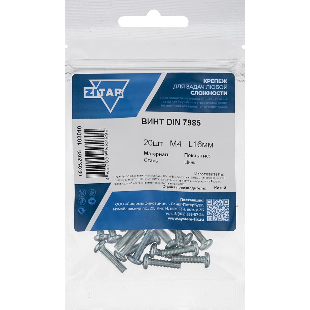 Винт DIN7985 с полукруглой головкой оцинкованный М4x16 20 шт Zitar 103010