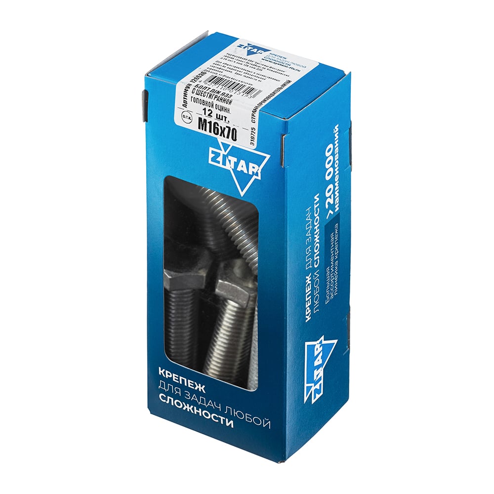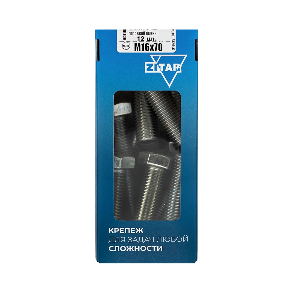Болт с шестигранной головкой DIN933 оцинкованный, М16x70 мм, 12 шт в коробке с окном Zitar 126536