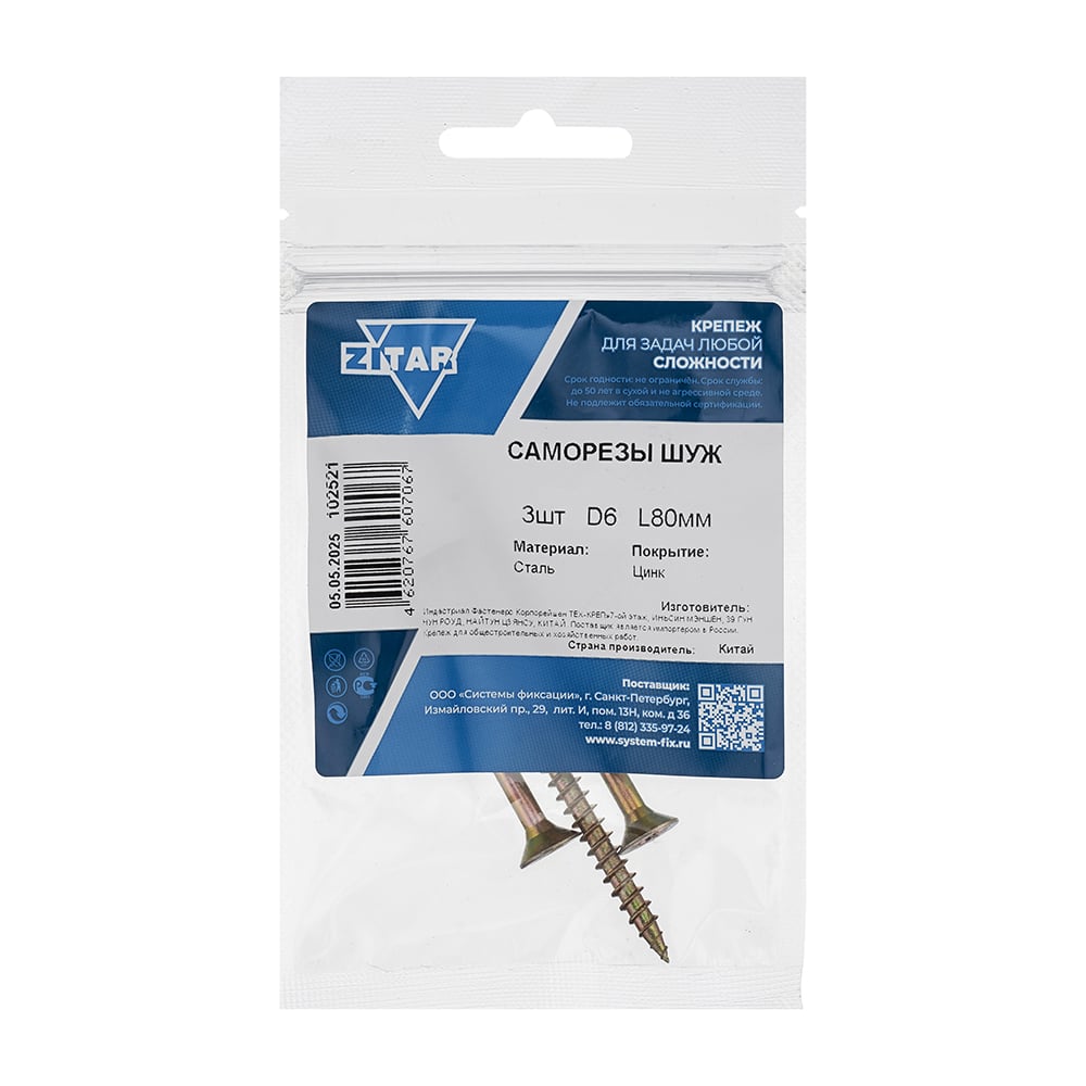 Саморез ШУж с потайной головкой 6,0x80 мм, 3 шт в пакете Zitar 102521