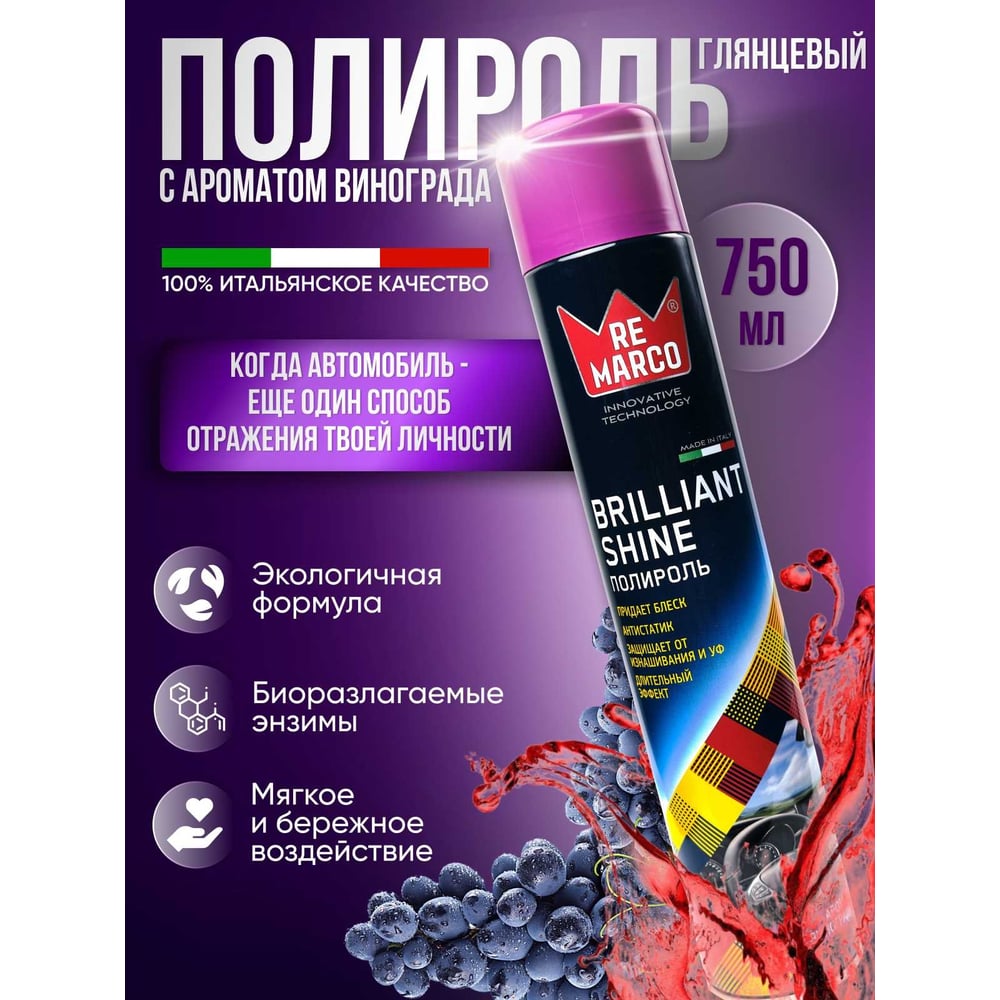 Полироль для пластика салона RE MARCO глянец, 750 мл, аэрозоль, виноград RM-807