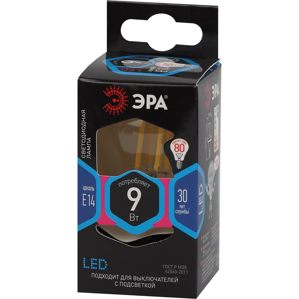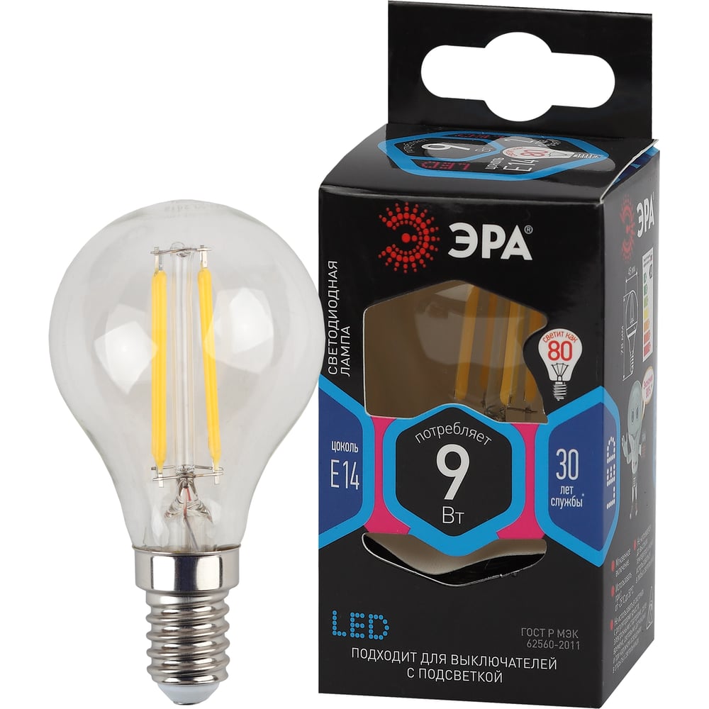 Филаментная лампа ЭРА FLED P45-9w-840-E14 шар, 9 Вт, нейтральная, E14, 10/100/4000 Б0047026