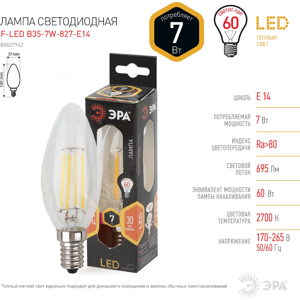 Светодиодная лампа ЭРА F-LED B35-7W-827-E14 филамент, свеча, теплый Б0027942