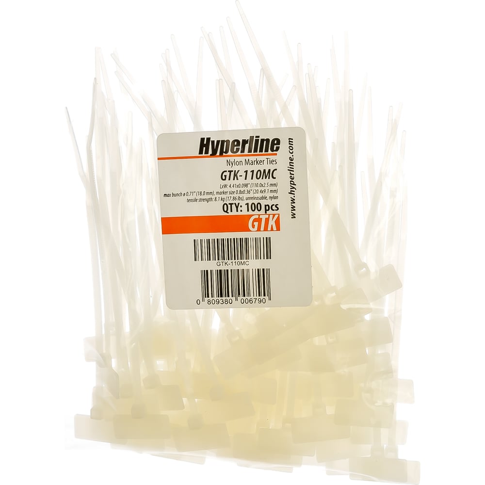 Нейлоновая стяжка Hyperline GTK-110MC безгал., 110x2.5 мм, полиамид 6.6, -40C - +85C, 100 штук 16067