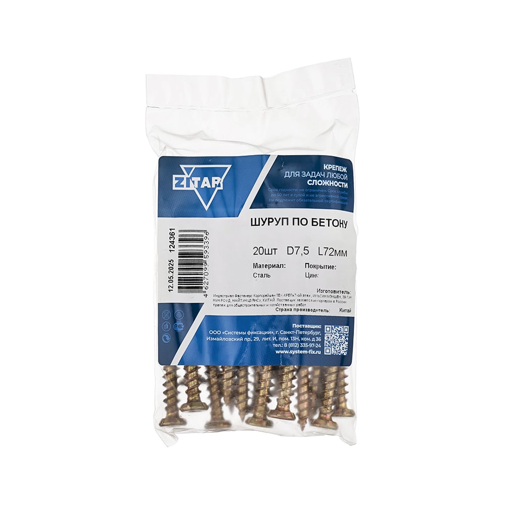 Шуруп по бетону, 7,5x72 мм, 20 шт. в пакете Zitar 124361