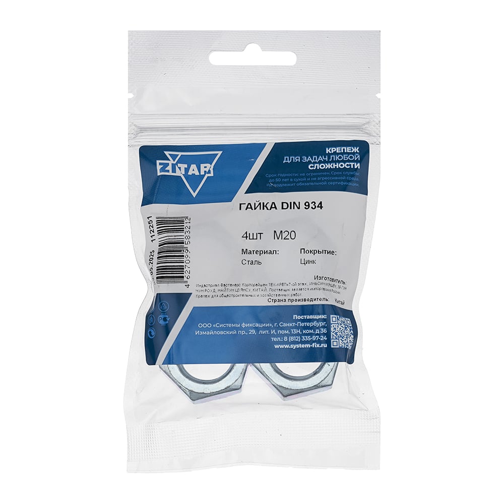 Гайка шестигранная DIN934 оцинкованная М20, 4 шт в пакете Zitar 112251