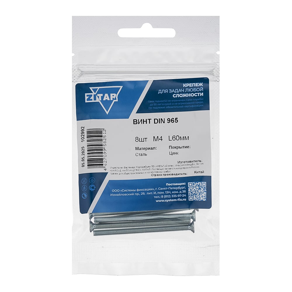 Винт DIN965 с потайной головкой оцинкованный М4x60 8 шт Zitar 102992