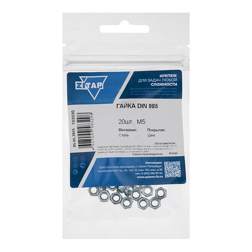 Гайка DIN985 самоконтрящаяся оцинкованный М5 20 шт Zitar 103030