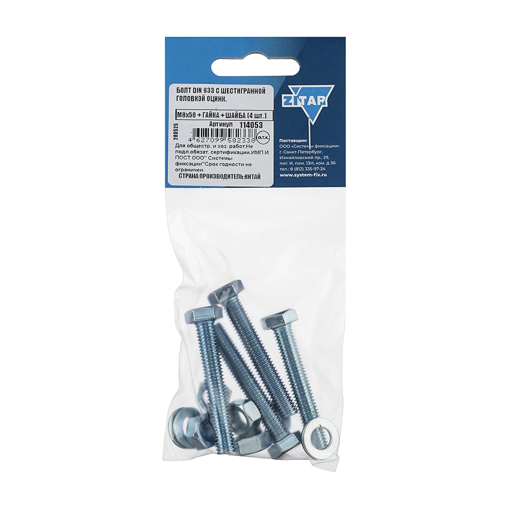 Болт с шестигранной головкой DIN933 оцинкованный М8x50 мм, в комплекте с гайкой и шайбой, 4 шт в пакете Zitar 114053