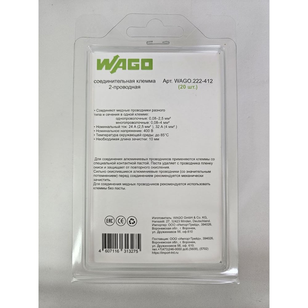 Соединительная клемма WAGO 2-х проводная 222-412 20 шт. 2530