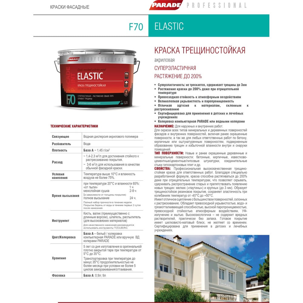 Краска фасадная PARADE трещиностойкая F70 база А шелковистая-матовая 9 л Россия 90005247875