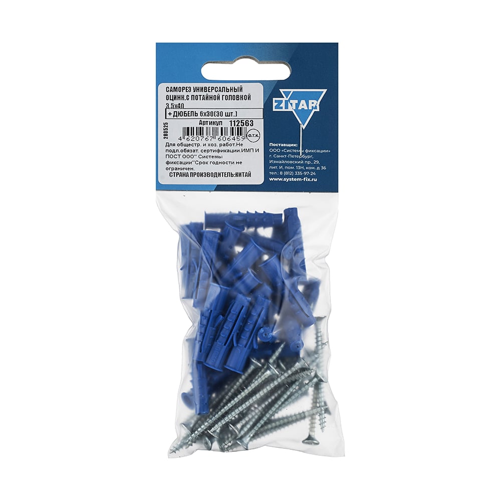 Саморез ШУц с потайной головкой 3,5x40 мм + дюбель 6x30 мм, 30 шт в пакете Zitar 112563