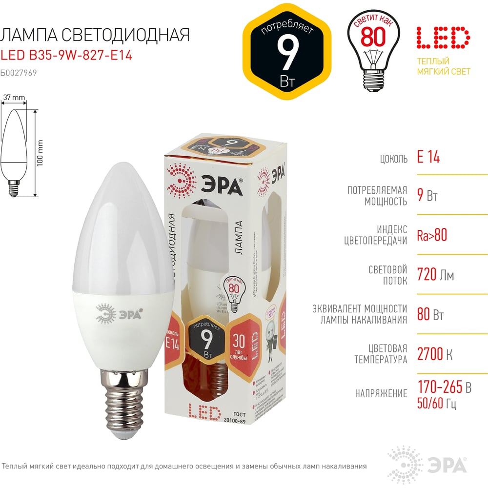 Светодиодная лампа ЭРА LED B35-9W-827-E14, свеча, теплый Б0027969