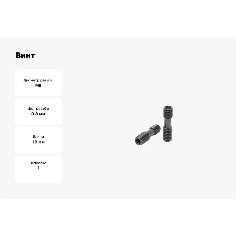 Шаг резьбы 0.8 мм Длина 19 мм Вид головки цилиндрическая с внутренним шестигранником Размер под ключ HEX2.5 Тип фасовки шт. Класс прочности 12.9 Диаметр резьбы М5 Направление резьбы правая/левая Материал сталь Покрытие оксидированное Тип неполная резьба Диаметр 5 мм Фасовка 0.002 кг Фасовка 1 шт