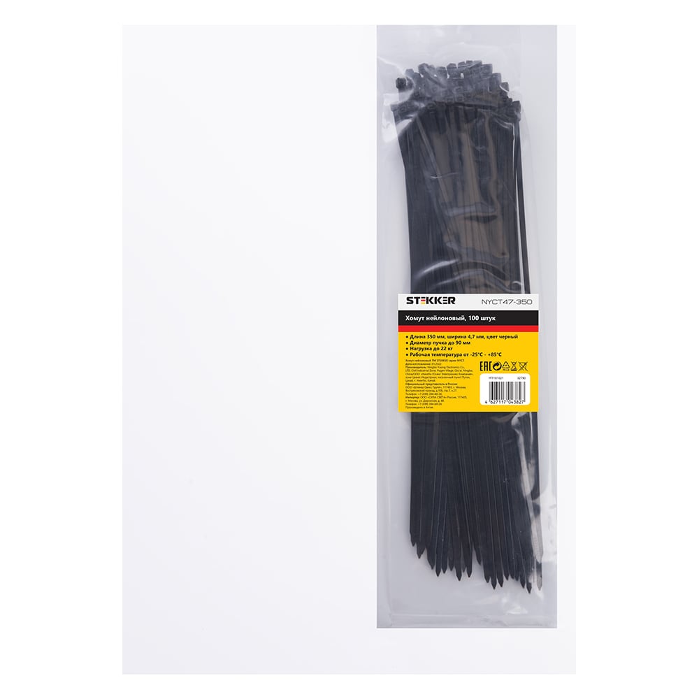 Хомут STEKKER NYCT47-350 нейлоновый 4.7x350 мм, 90 мм, нагрузка 22 кг, черный, 100 шт в упак 32790
