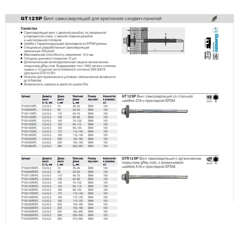Винт для сэндвич-панелей Etanco GT12 SP 5.5x285, 100 шт. P1552850PL