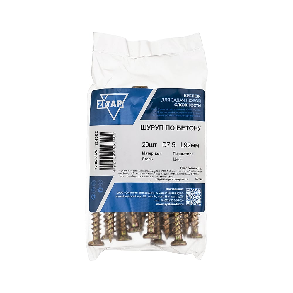 Шуруп по бетону 7,5x92 мм, 20 шт в пакете Zitar 124362