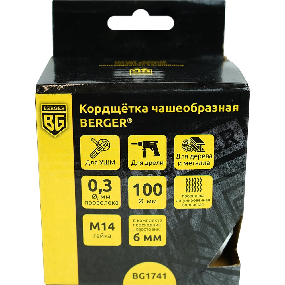 Кордщётка чашеобразная 100 мм, латунированная сталь 0.3 мм, М14, адаптер на 6 мм Berger BG BG1741