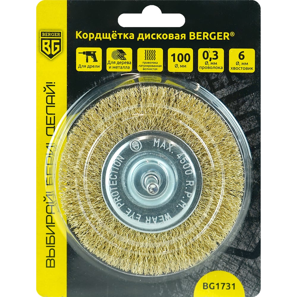 Кордщётка дисковая 100 мм, латунированная сталь 0.3 мм, хвостовик 6 мм Berger BG BG1731