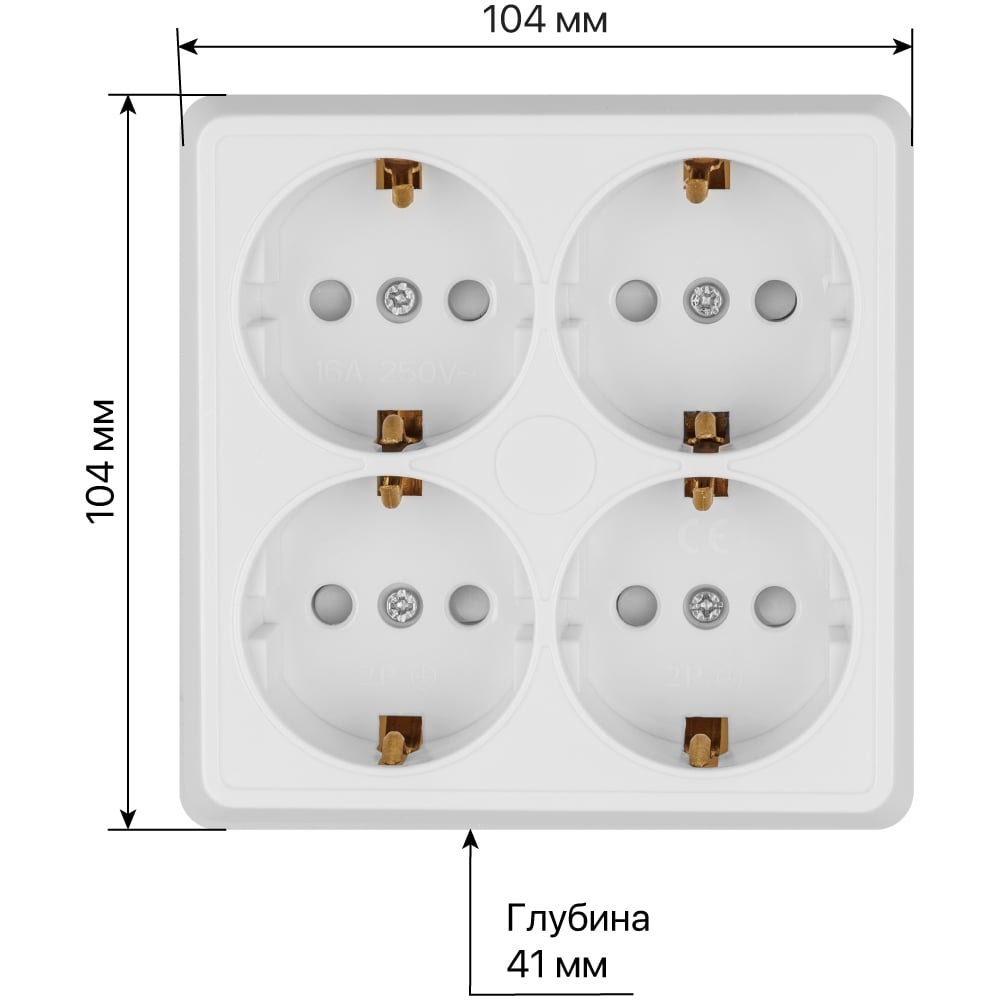 Материал пластик Цвет белый Вес нетто 0.121 кг Серия Ладога Форма квадратная Степень защиты IP20 ГОСТ ГОСТ Р 51322.1-2011 (МЭК 60884-1:2006) ГОСТ Р 51322.2.2-99 (МЭК 60884-2-2-89) Номинальное напряжение 250 В Количество в упаковке 1 шт Количество модулей нет Заземление есть Монтаж накладной (открытый) Модульная нет Палитра белый Max ток 16 А Количество гнезд 4 Крышка нет Вид розетки силовая Тип комплектации розетка в сборе Количество постов 4 Рамка не требуется(идет в комплекте) Защитные шторки есть Ширина устройства 103 мм Высота устройства 103 мм Глубина устройства 40 мм Зажимная система винты Количество фаз 1 шт Ориентация монтажа горизонтальная Наличие задней стенки да