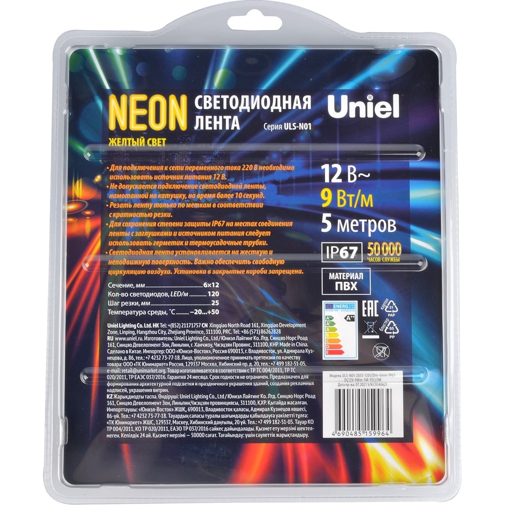 Гибкая светодиодная лента Uniel NEON ULS-N01-2835-120LED/m-6mm-IP67-DC12V-9W/m-5M-YELLOW L-00009088