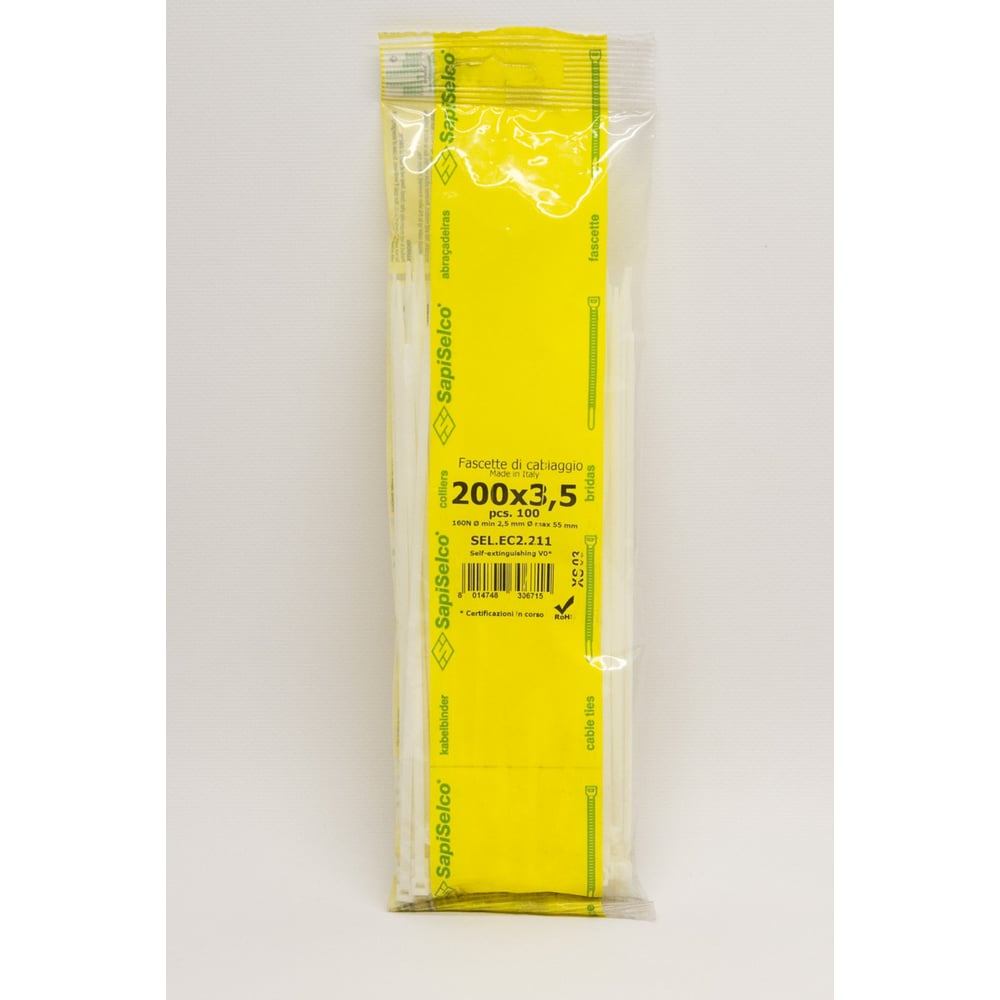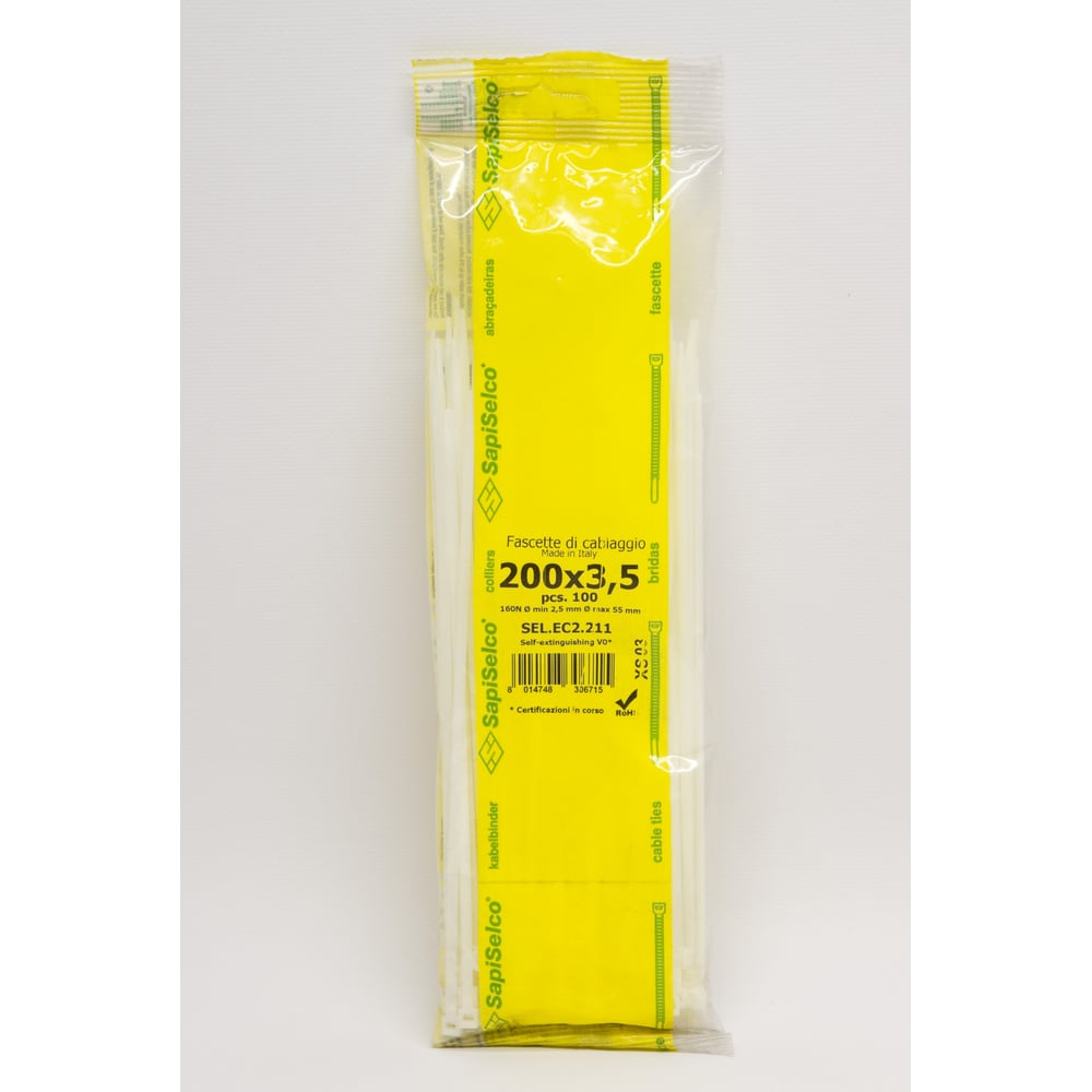 Самозатухающие стяжки SapiSelco белого цвета, 3.5x200 мм, полиамид 6.6, 100 шт. SEL.EC2.211
