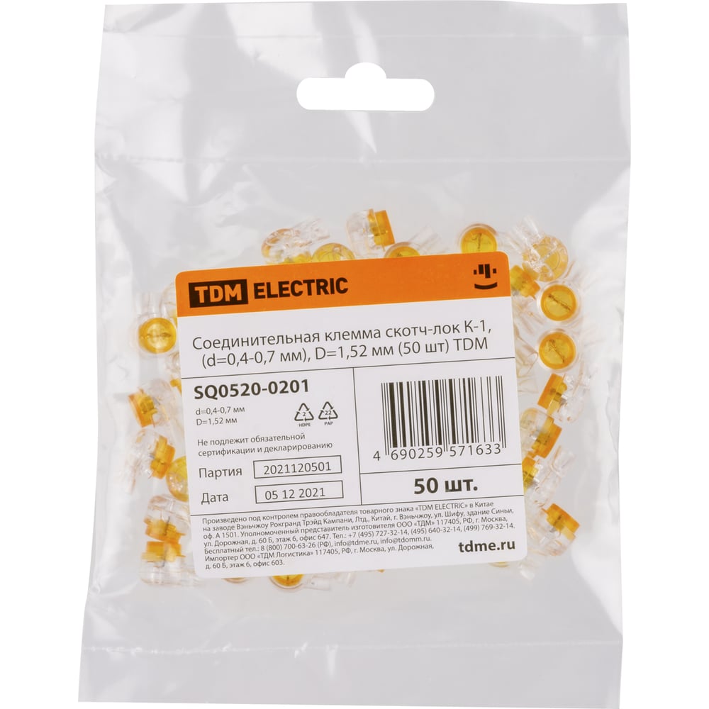 Клемма TDM ELECTRIC соединительная скотч-лок К-1, (d=0,4-0,7 мм), D=1,52 мм упаковка 50 штук SQ0520-0201