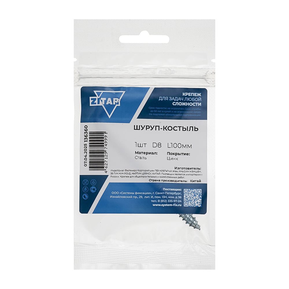 Шуруп-костыль Zitar 8,0x100 1 шт - пакет 136360